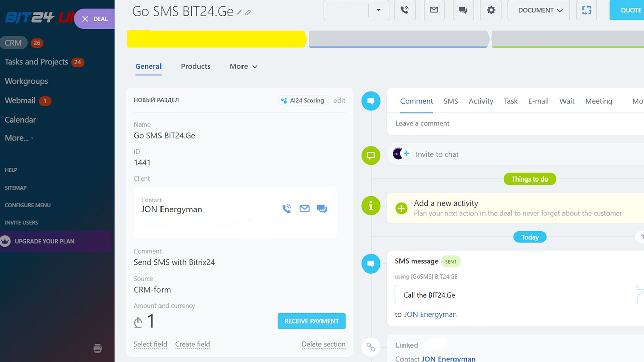 Service GoSMS BIT24.Ge shows the status of the sent SMS: sent, delivered.