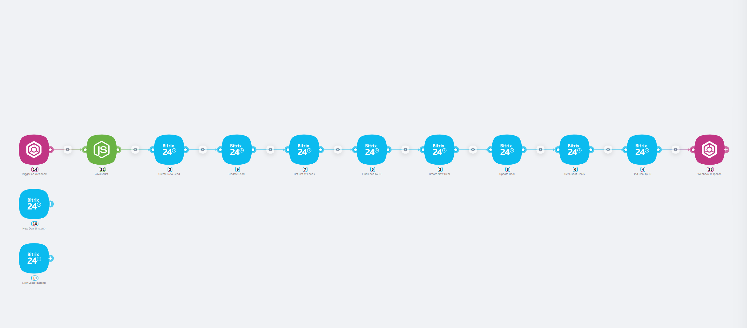 Latenode supports HTTP requests and Webhooks, enabling interaction with external APIs such as Google Sheets, Airtable, AI, or third-party CRMs such as HighLevel. This is useful for automating data updates in Bitrix24, such as adding deals based on updates from external sources.