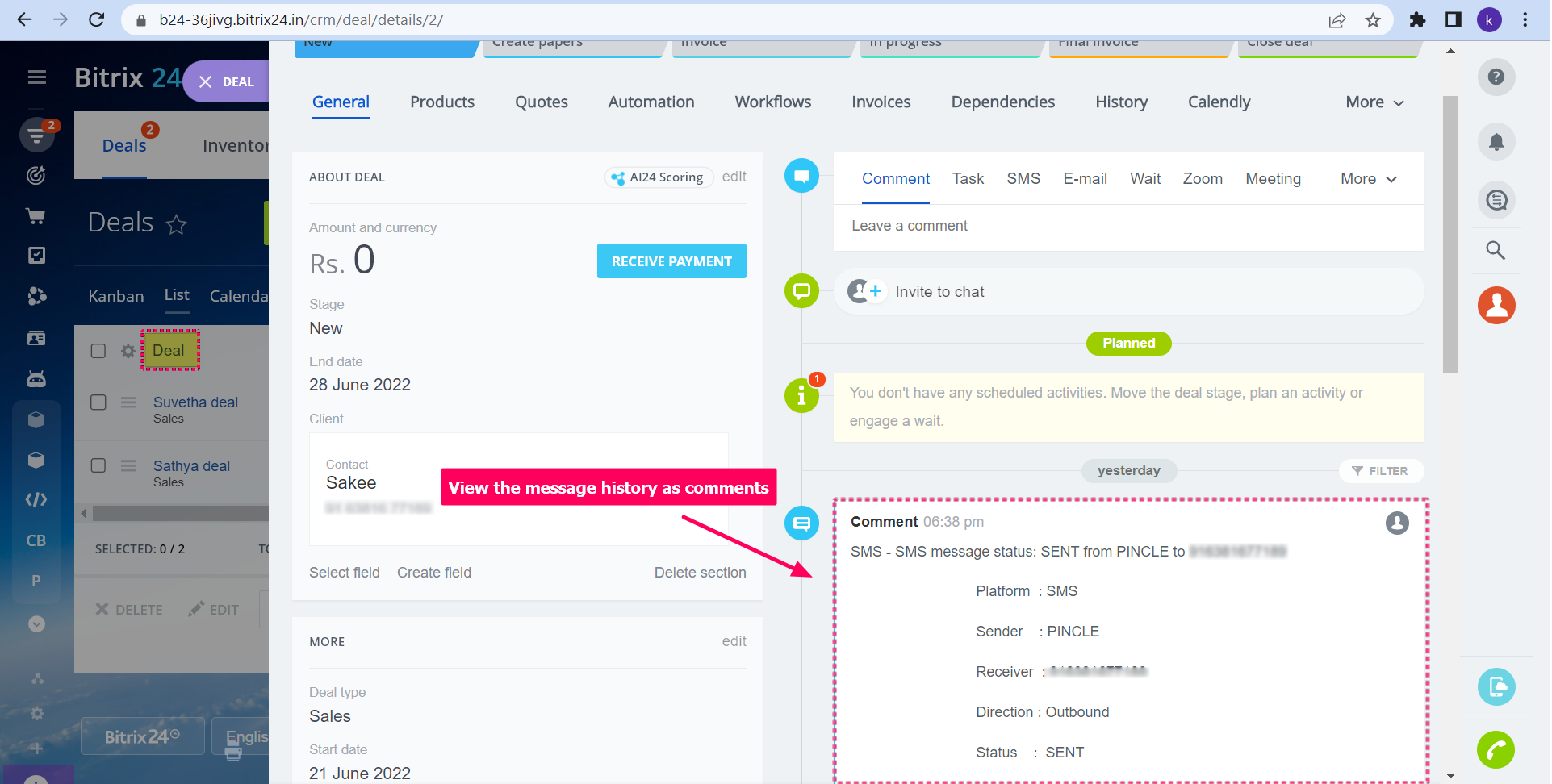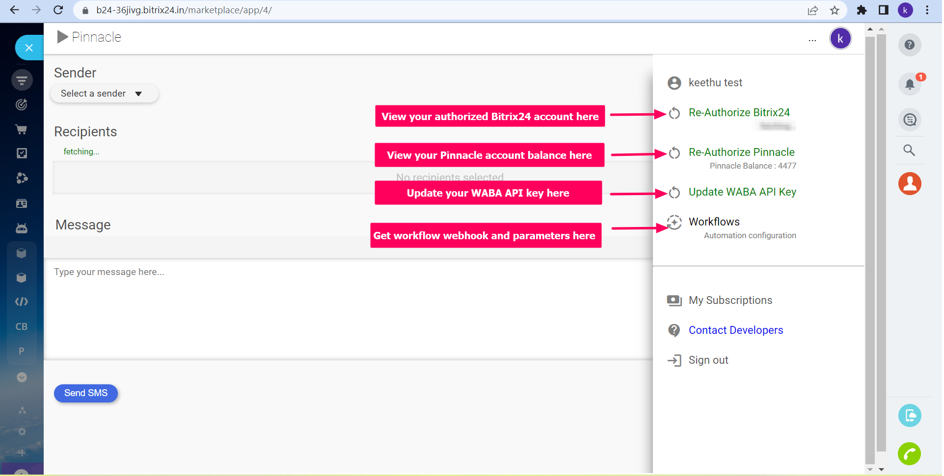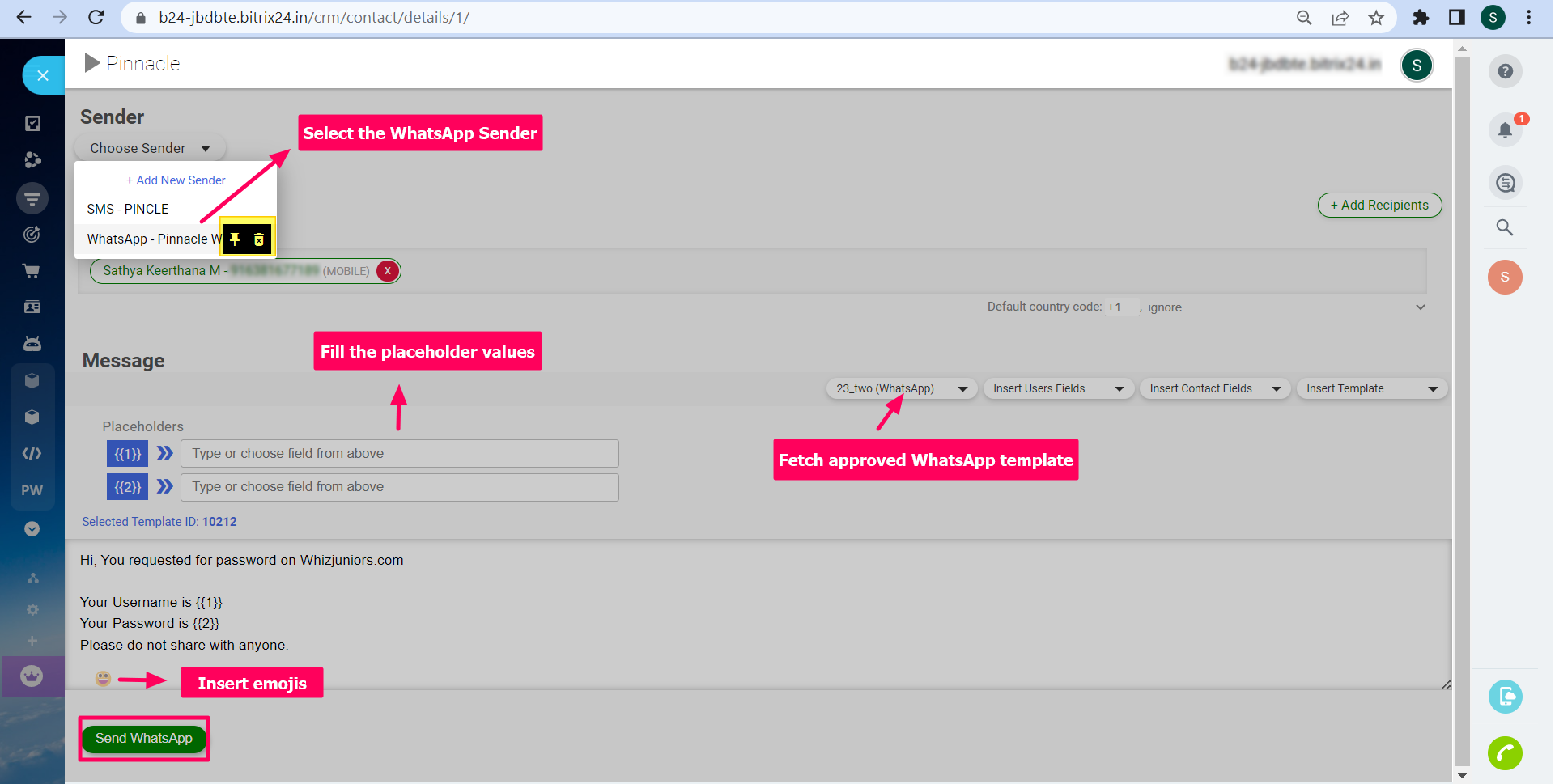 Envíe mensajes masivos de SMS y WhatsApp a todos sus contactos, clientes potenciales y negocios desde Bitrix24 CRM a través de la extensión Pinnacle.