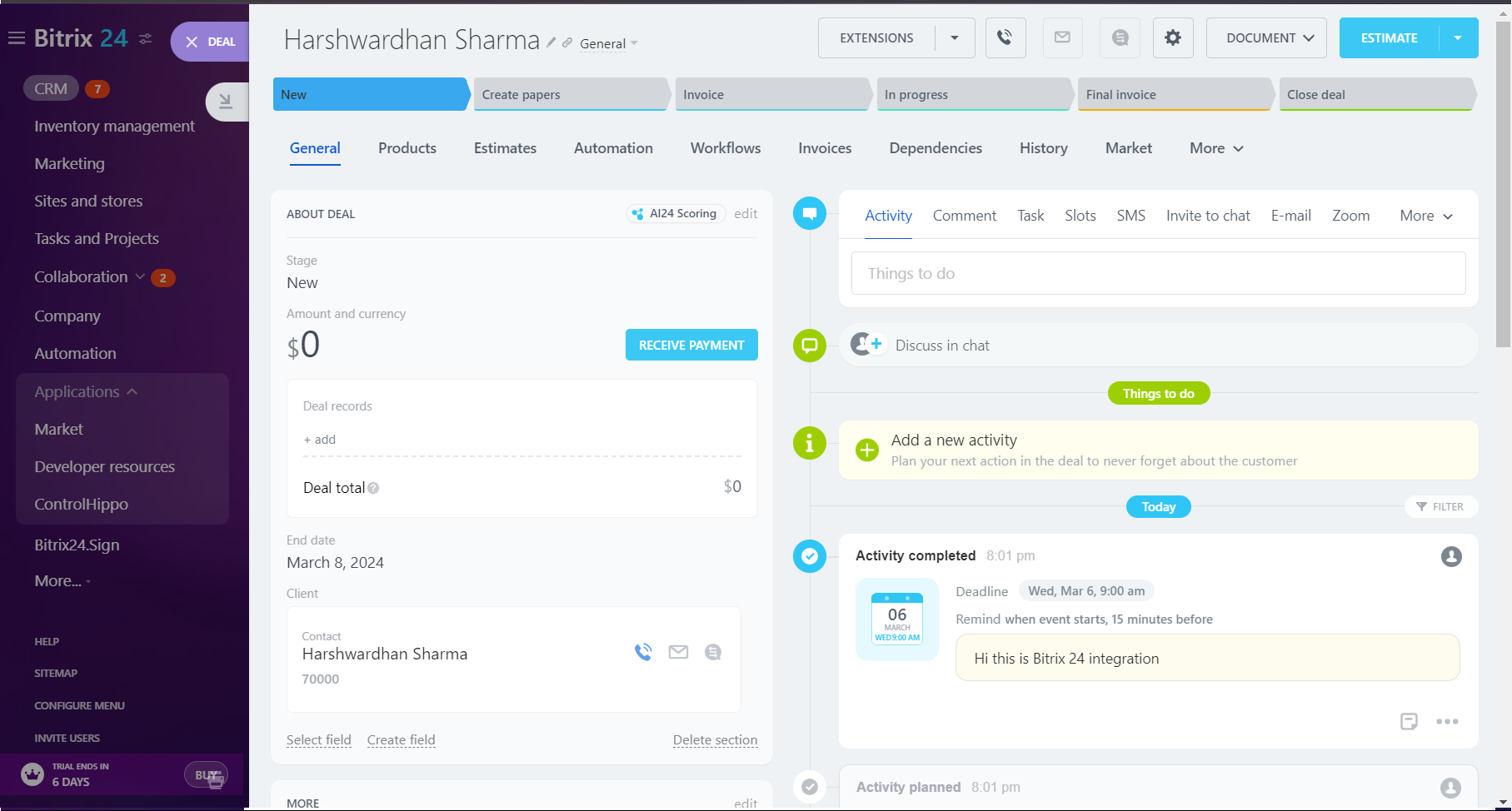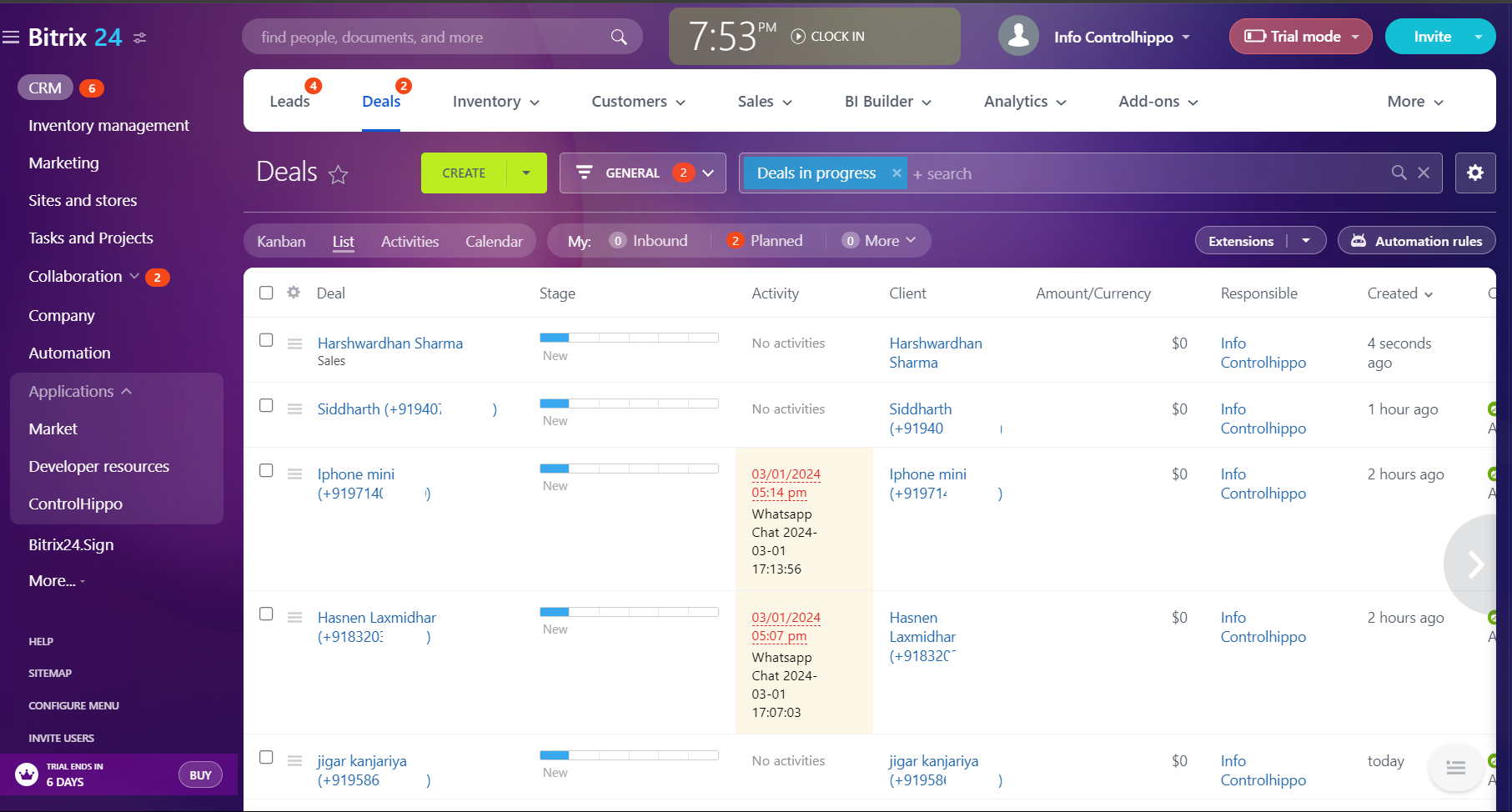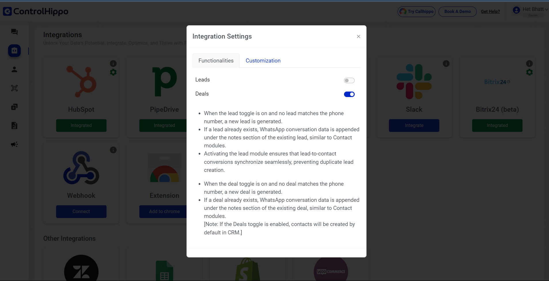 Deals: Upon enabling the deals toggle in controlhippo, we create the new deal and contact in the Bitrix24 and sync message activity in deal only. If the deal already exits then we do not create new deal, just sync the message activity in the present deal.