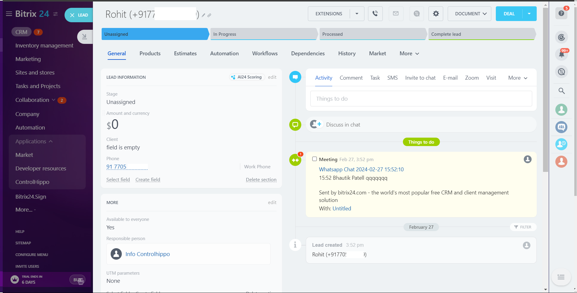 Leads: Upon enabling the leads toggle in controlhippo, we create the new lead of that controlhippo contact in the Bitrix24 and sync message activity in it. If the lead already exist of that contact then we sync the activity in that lead without creating the new.