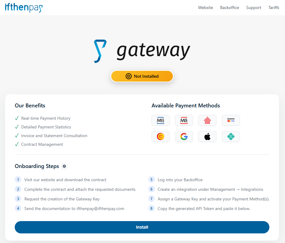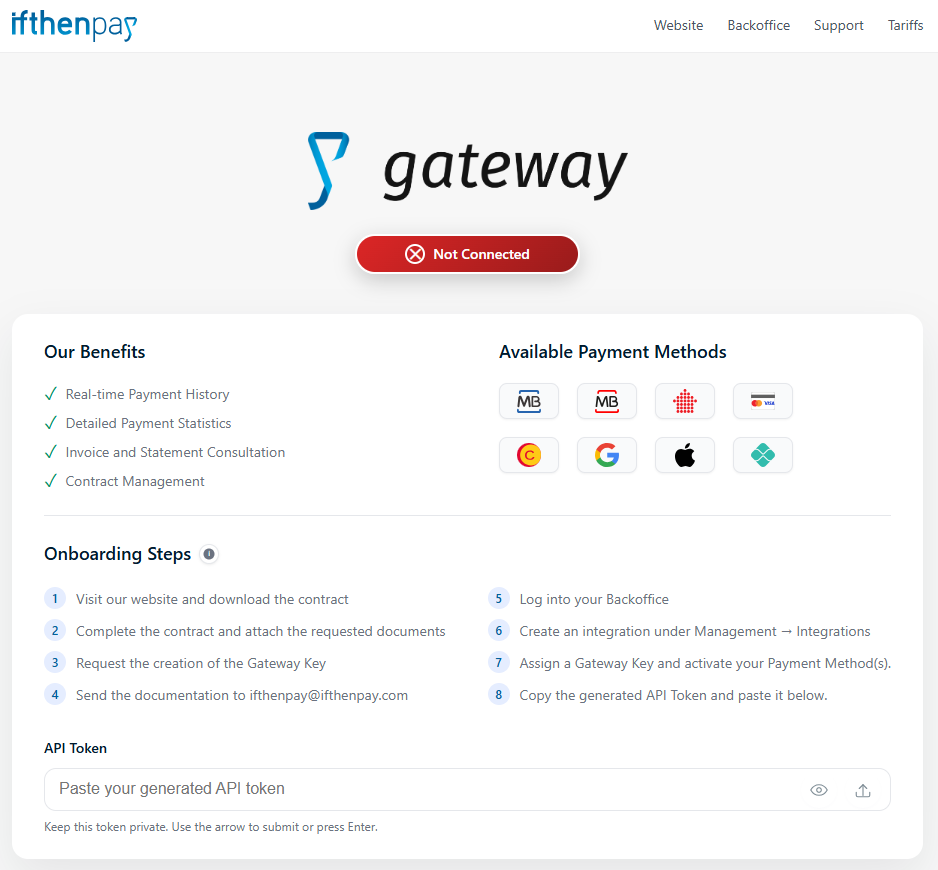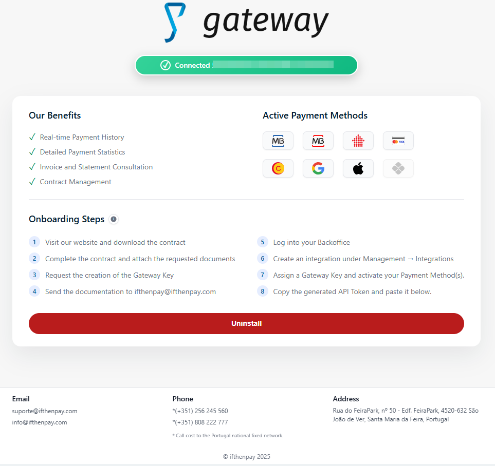 Para desbloquear todo el potencial de esta integración, los usuarios deben disponer de una cuenta activa de ifthenpay. Una vez suscrito, deberás activar una Gateway Key y asociar/activar tus Métodos de Pago seleccionados poniéndote en contacto con nuestro servicio de asistencia. Ten en cuenta que nuestros servicios funcionan con una estructura de tarifas; los usuarios deberán consultar en nuestra página web las tarifas aplicables a cada método de pago.