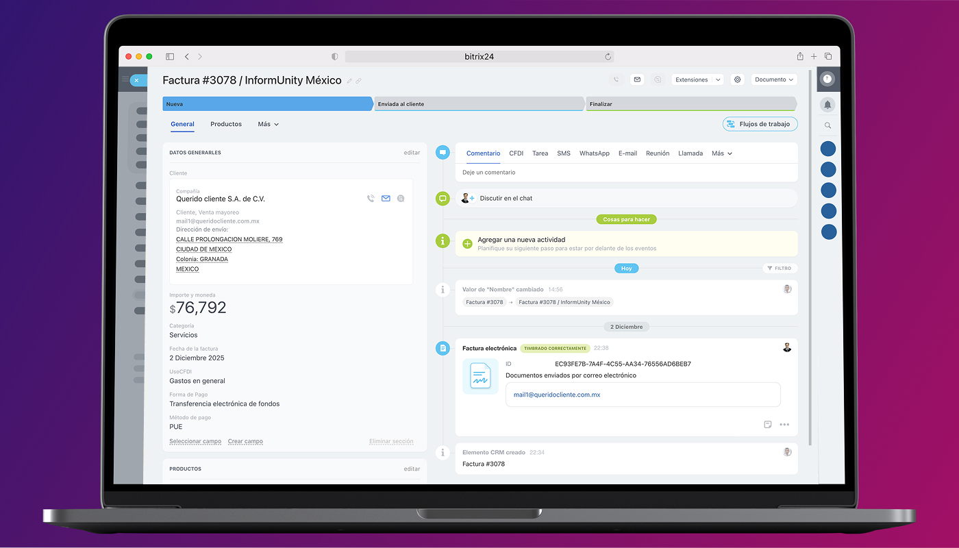 - Emisión y timbrado CFDI 4.0 desde Bitrix24: genera facturas electrónicas sin salir de tu entorno de trabajo, aprovechando los datos ya registrados en el CRM.