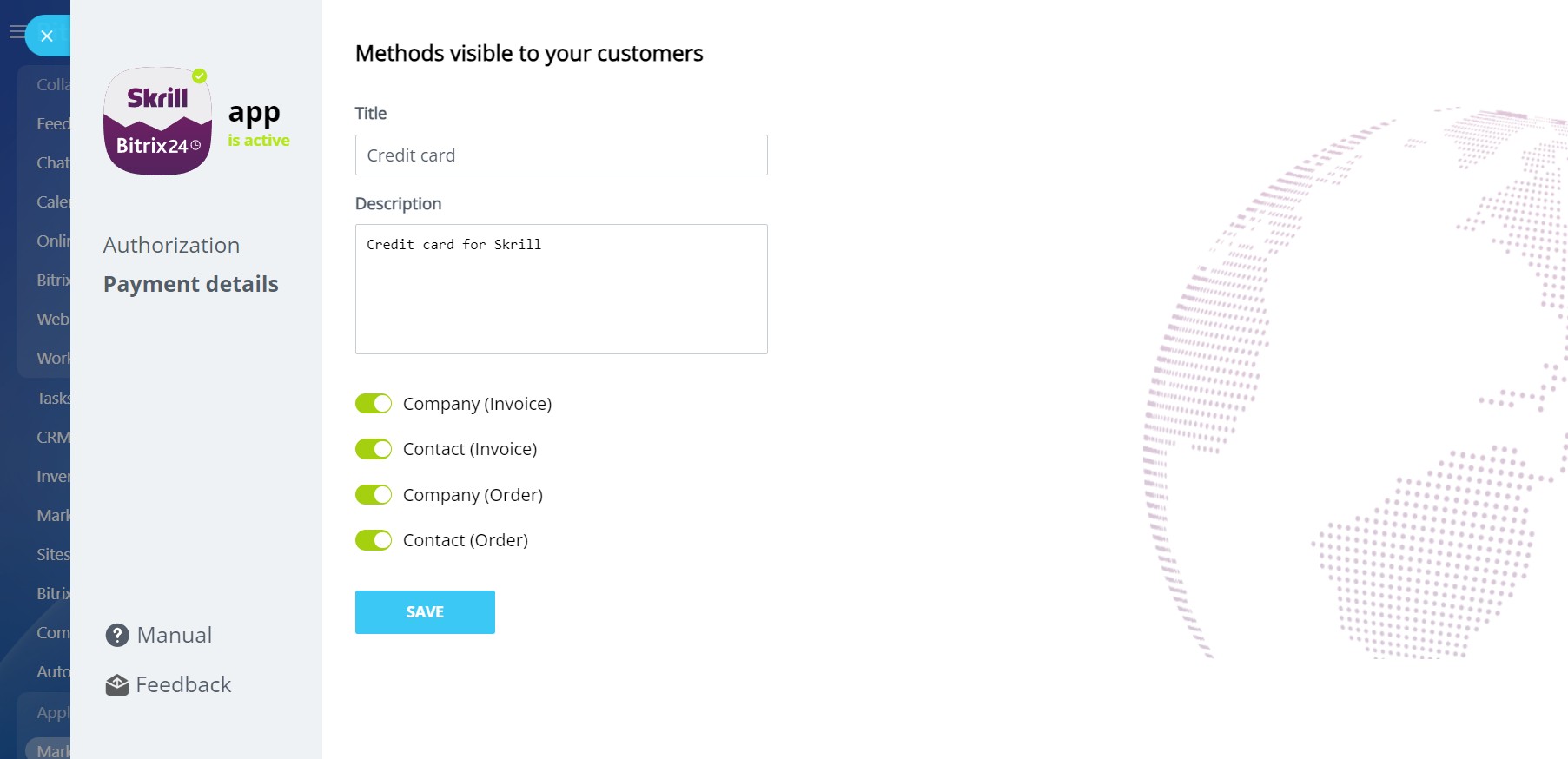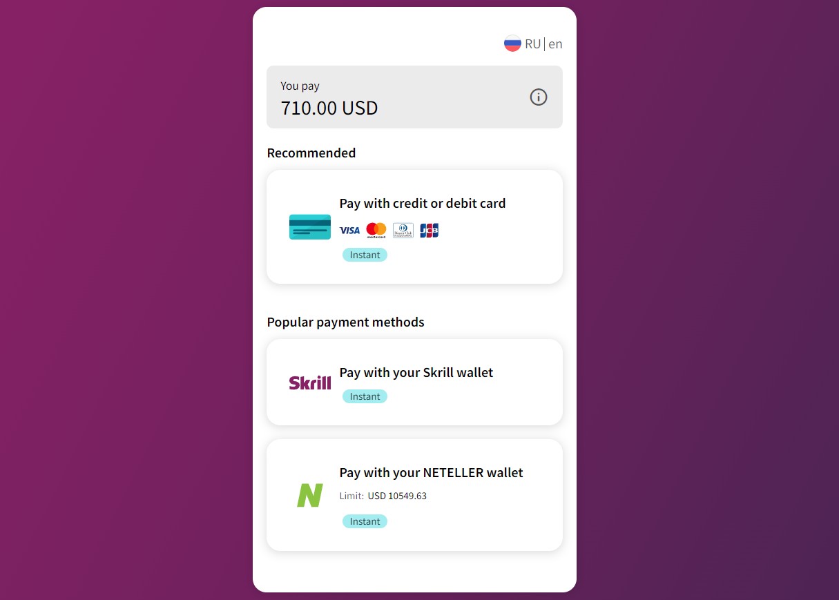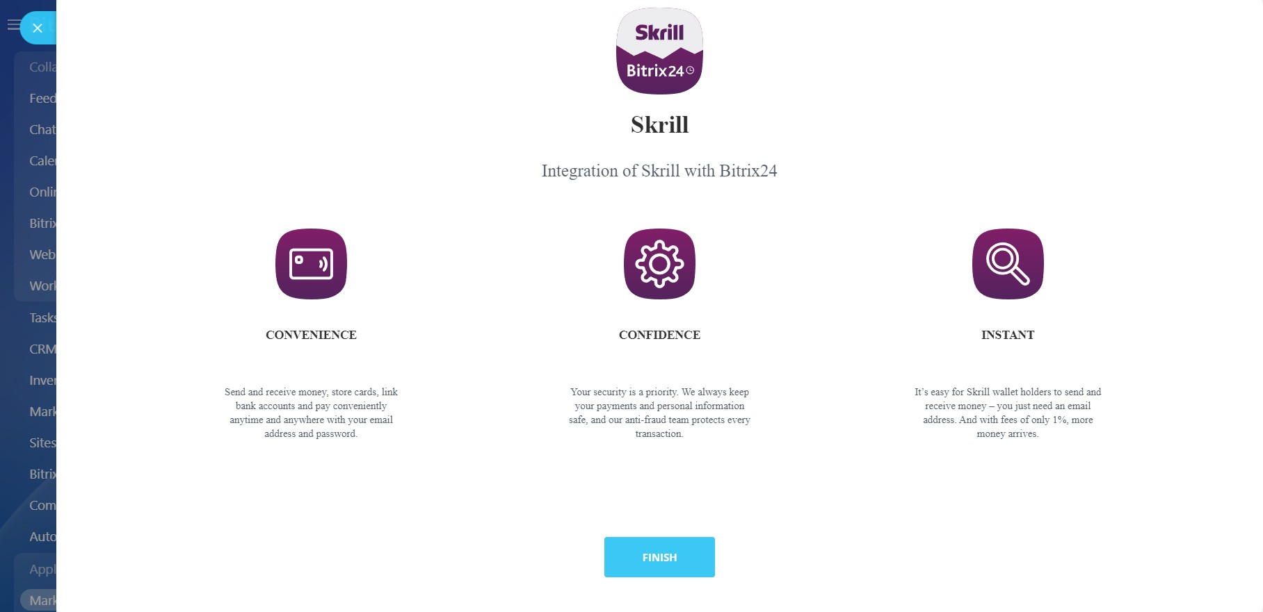 Once your client receives a payment or invoice link, they will be able to pay for the order by clicking on the Skrill option button (with the name you define in the app's settings). The invoice status in Bitrix24 will be changed automatically once the payment is processed by Skrill.