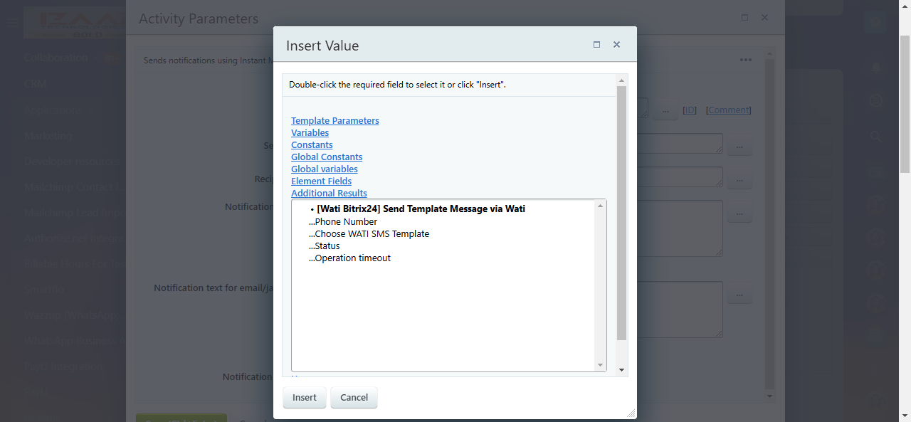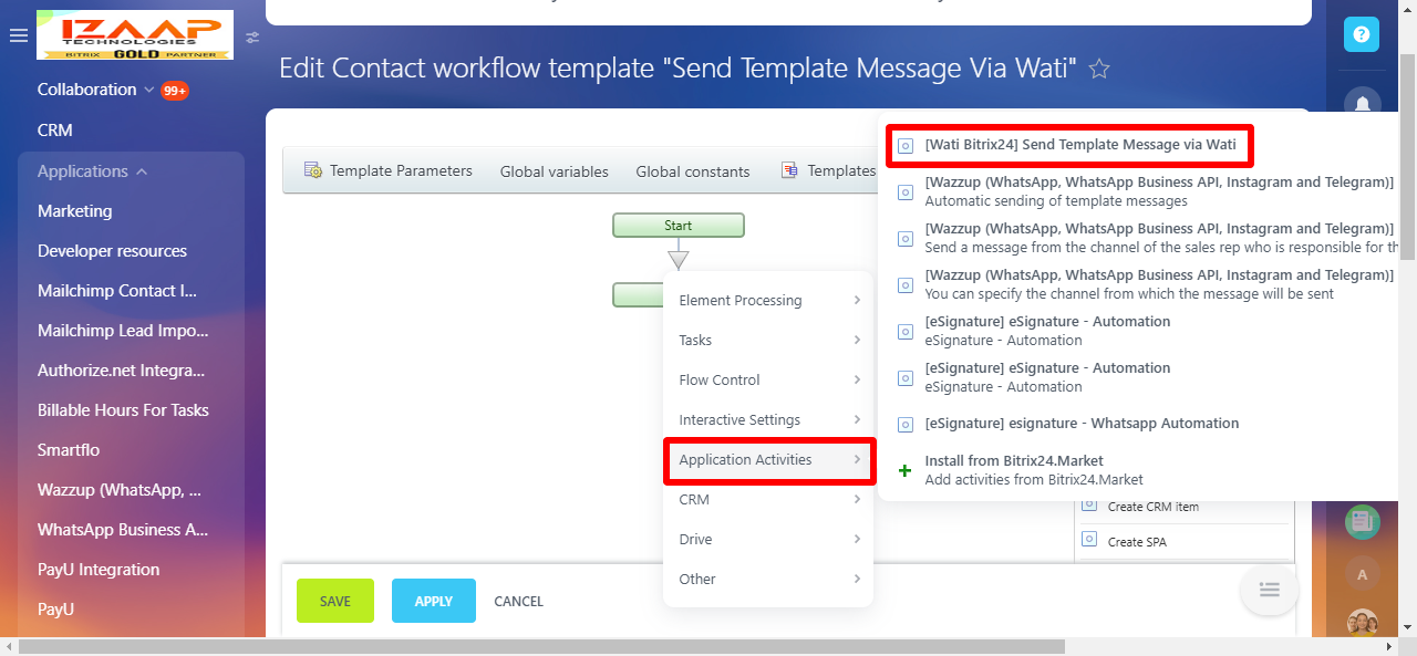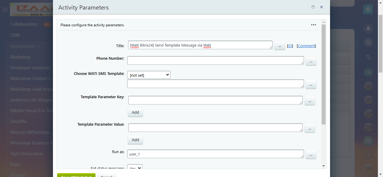 9.In Bitrix CRM, you can send template messages to customers via workflow. In the workflow, choose Application Activities → [Wati API] Send Template Message. Enter the customer’s phone number, sel ect the Wati template, and specify the template parameter key and value, then click Send. After sending the message, you can view the return response in the additional results of the workflow. Please note that in Wati templates, parameter variables are enclosed in curly braces. You should enter these template parameter variables in the template parameter key, while the corresponding values should be specified in the workflow in sequential order, similar to the Wati template. If the template parameter key and value are left empty, the system will use the key and value fr om the Wati template. The workflow return response will contain information about the status, phone number, and Wati template details.