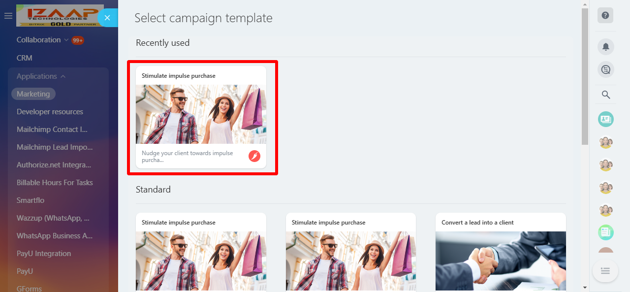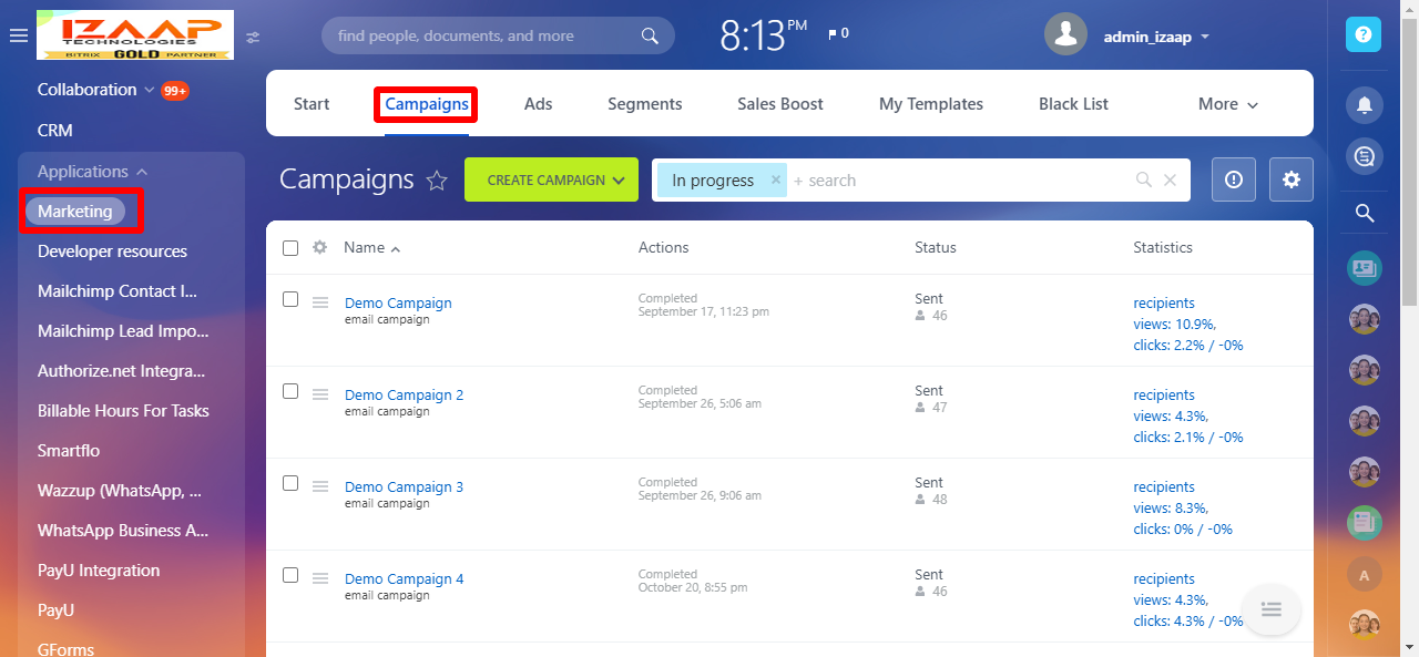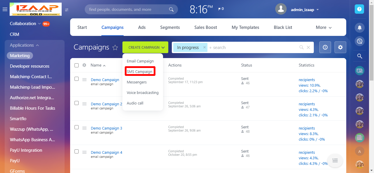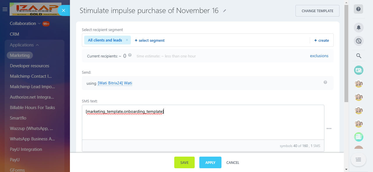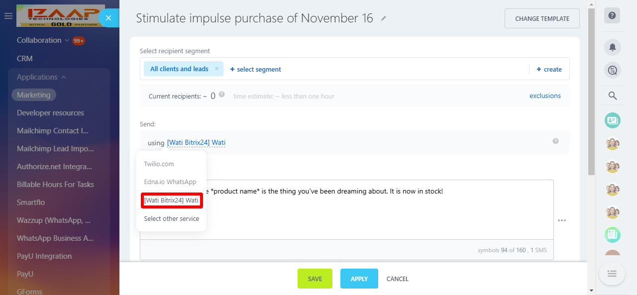 10.To send a bulk SMS campaign to your customers, go to the Marketing menu in Bitrix CRM and sel ect Campaign fr om the top menu. Choose SMS Campaign as the campaign type and sel ect the template. After selecting the template, choose the SMS provider type and create a segment. Specify the template names in the message textbox in the following format: [wati_template,wati_template2]. You can copy the template names fr om the Wati account under the Broadcast section and paste them in the specified format. After saving, you can schedule the campaign's sending date and time. Once the template message is sent to customers, you can track the delivery details on the SMS campaign listing page. For regular messages, please use the message content in the message textbox.