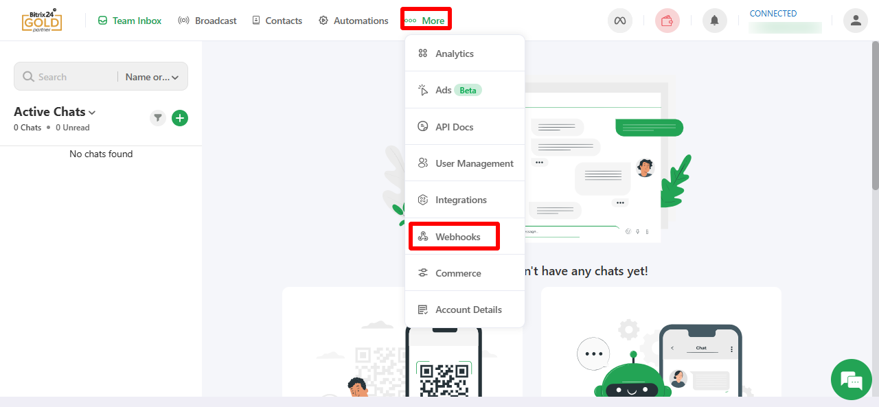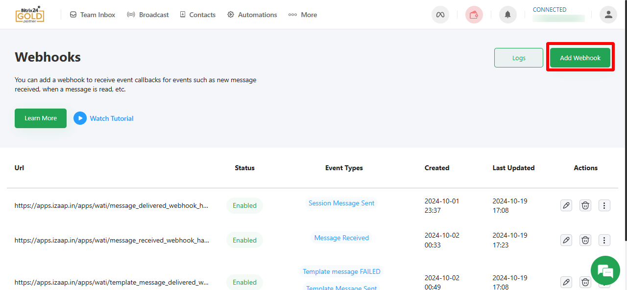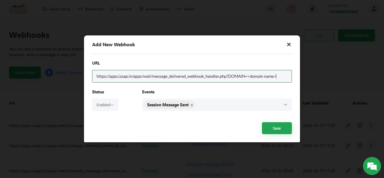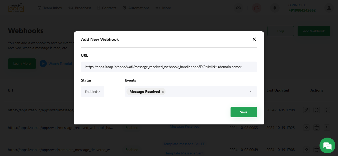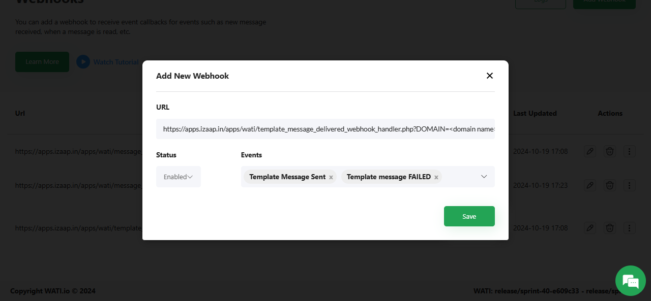 11.To capture incoming messages from customers and sent message statuses, please configure the following webhook URL in the Wati webhook section. In your Wati account, go to More → Webhooks → Add Webhook. Enter the handler URL below, choose the appropriate event type, sel ect the enabled option fr om the dropdown, and then save it.