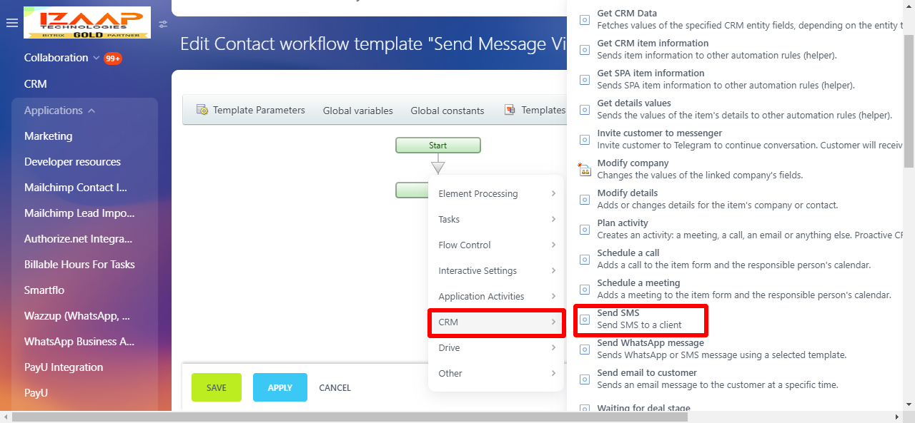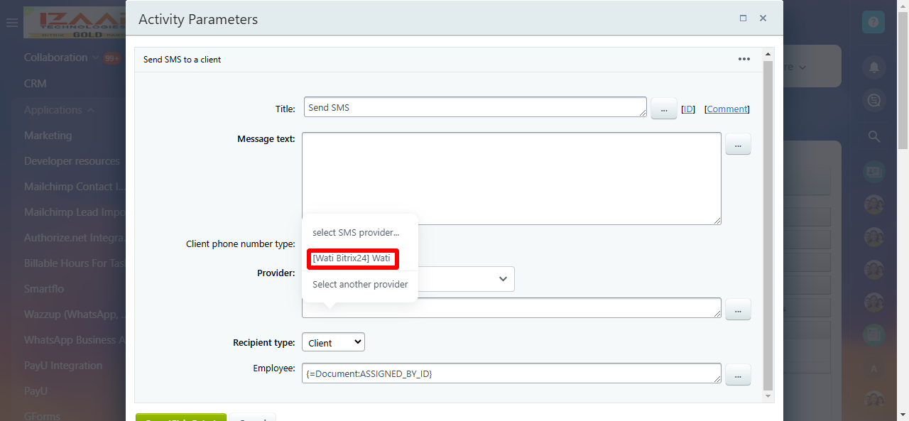 7.In Bitrix CRM, you can also send SMS to customers via the workflow. In the Workflow section, click on CRM → Send SMS. Choose the Wati option fr om the provider type. The response will be displayed in the timeline section of the same CRM entity.