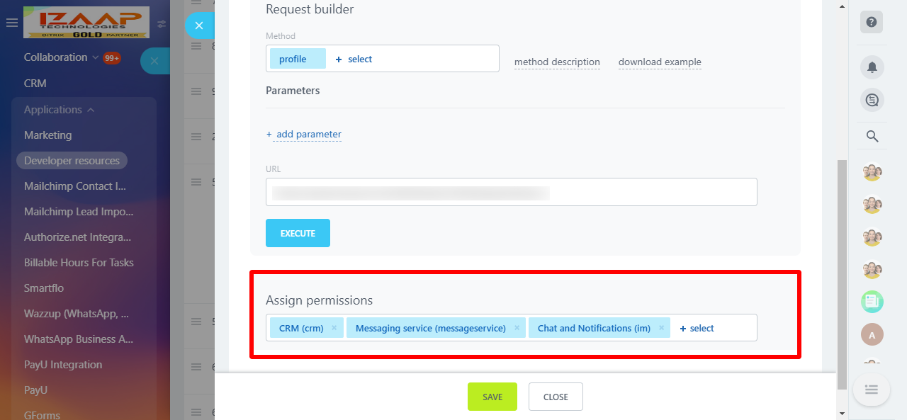 3.Create inbound webhook url in Bitrix CRM with CRM, Messaging service and Chat and Notifications scope.