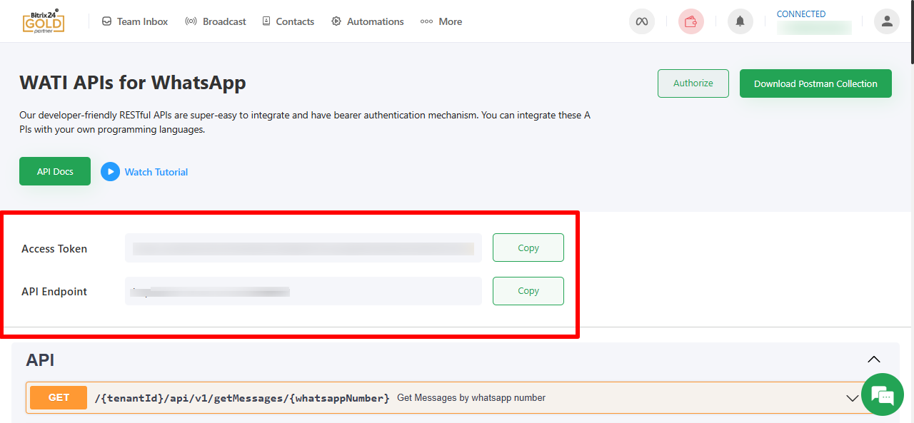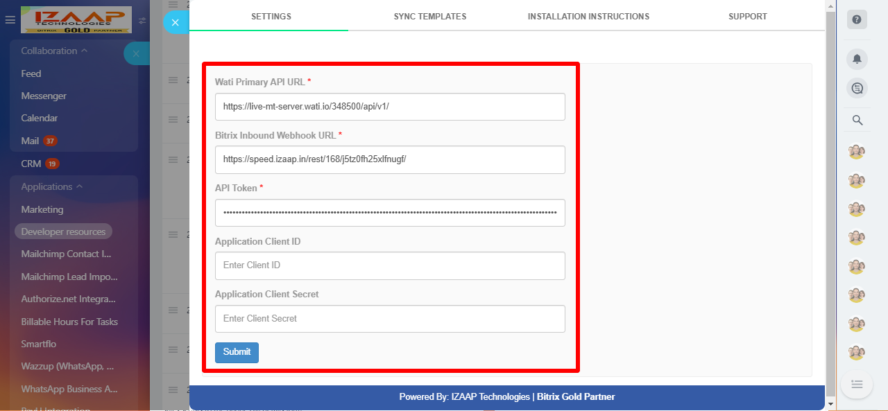4.Please paste the Wati API Endpoint, Access Token, Bitrix inbound webhook details in respective fields on the Bitrix marketplace app settings tab after the app installation. For the open channel configuration, please create a new application on the developer resources page. After installation, copy and paste the Client ID and Client Secret into the corresponding fields (Application Client ID and Application Client Secret) on the same page. Click here for the open channel configuration steps
