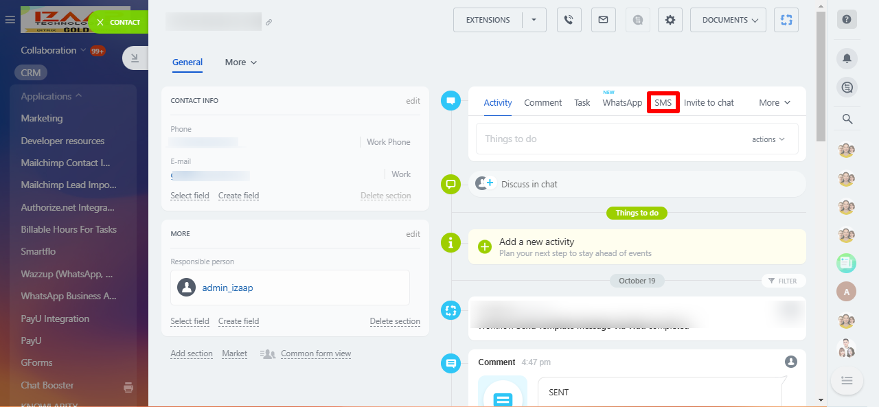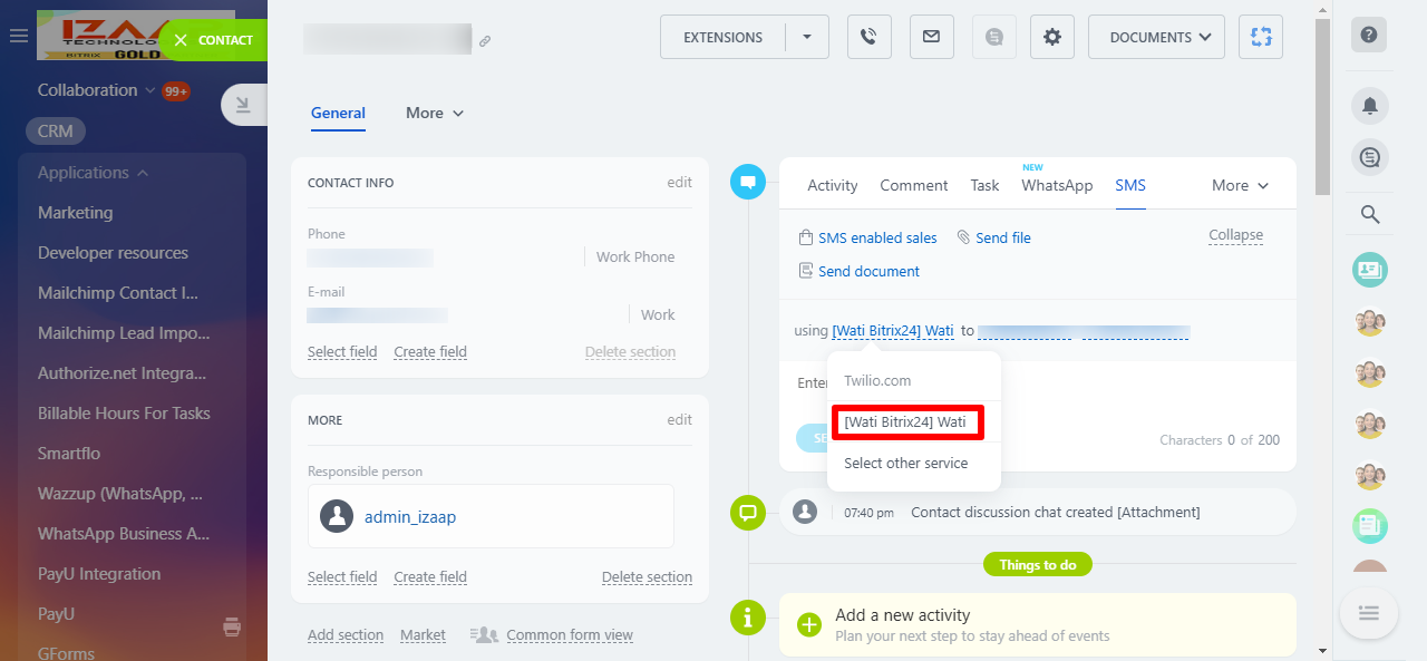 6.In Bitrix CRM, go to CRM → Contacts → Contact Detailed Page. Click on the More option in the timeline section and sel ect SMS (or choose SMS directly fr om the tab). Then, click More and sel ect the Wati option. Enter your message text and click Send. The response will be displayed in the same timeline section.