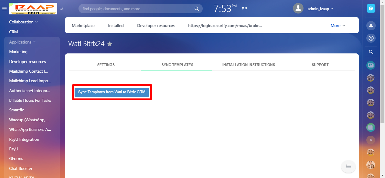 5.Synchronize the Wati templates with Bitrix CRM. After installing the app, use the 'Sync Templates' tab on the Marketplace app page. Whenever a new template is added or an existing template is updated in Wati, please use this option.