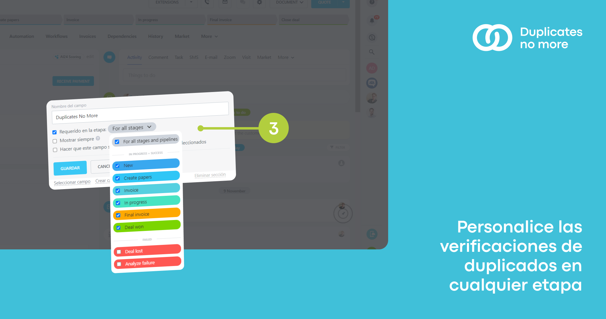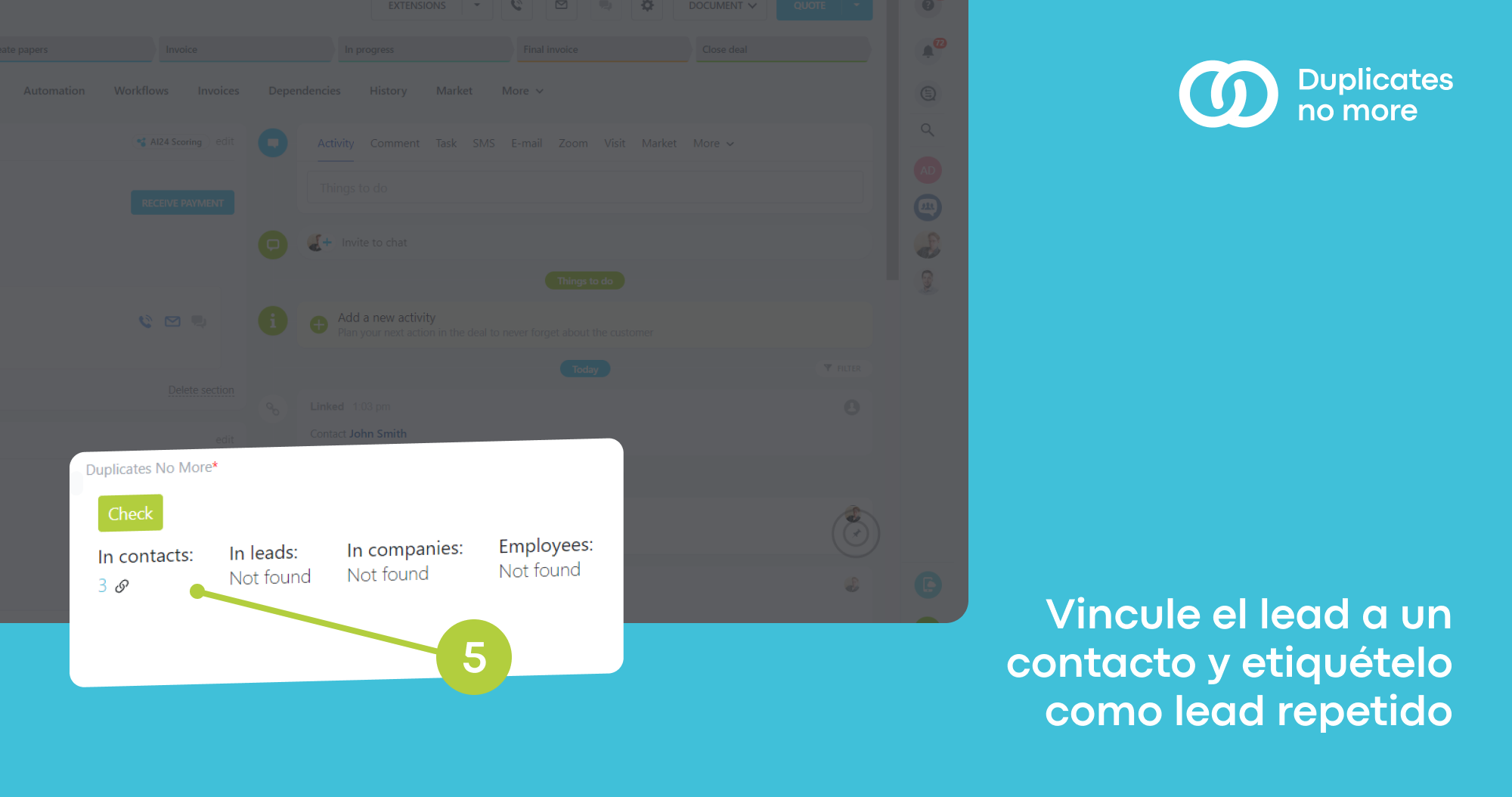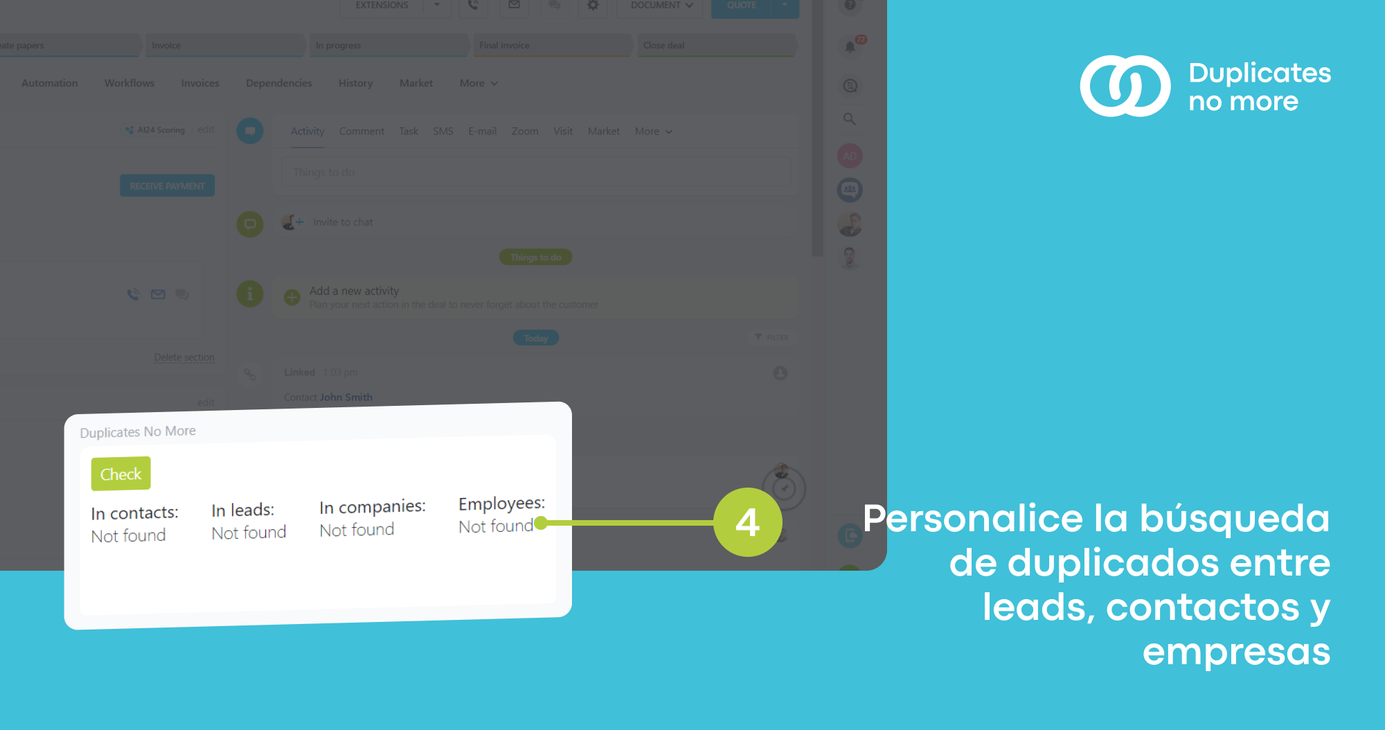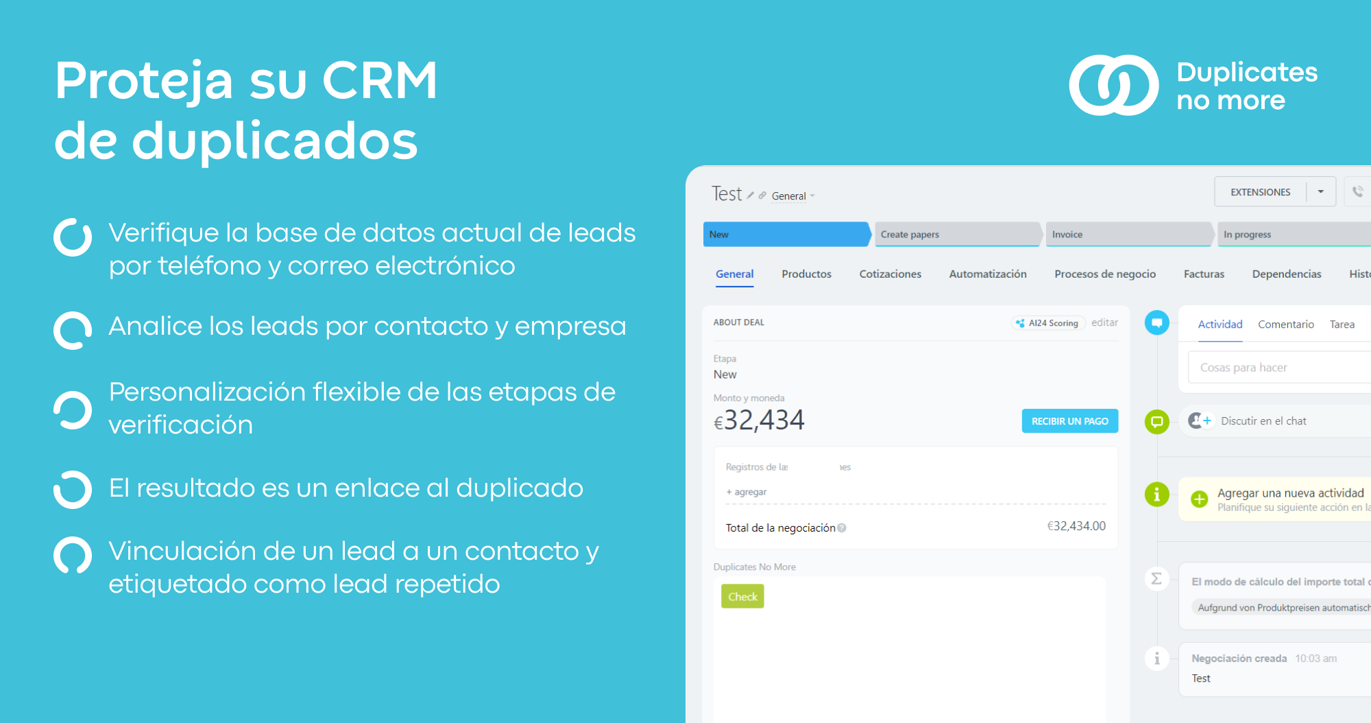“Duplicates no more” es una forma confiable de proteger su CRM de clientes potenciales, acuerdos, etc. duplicados.