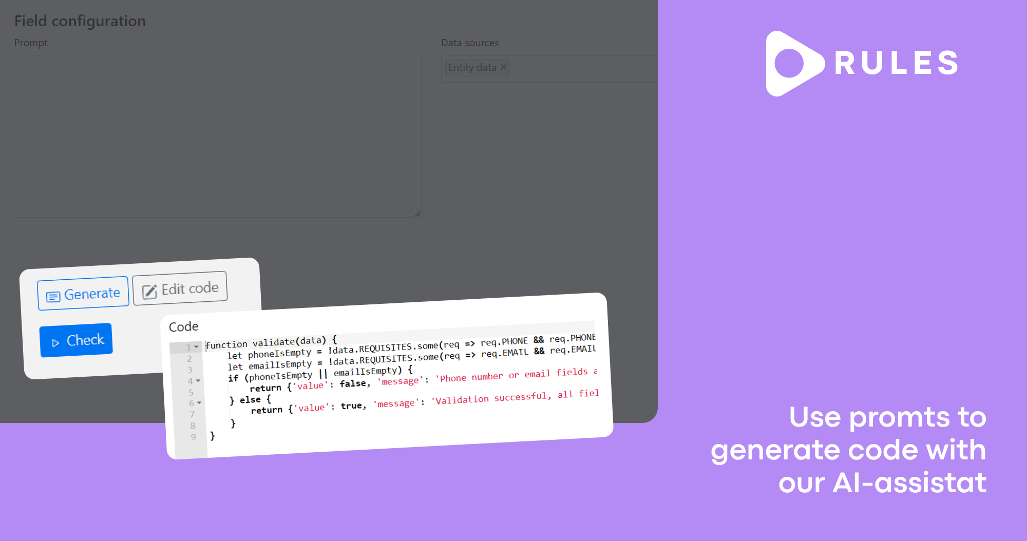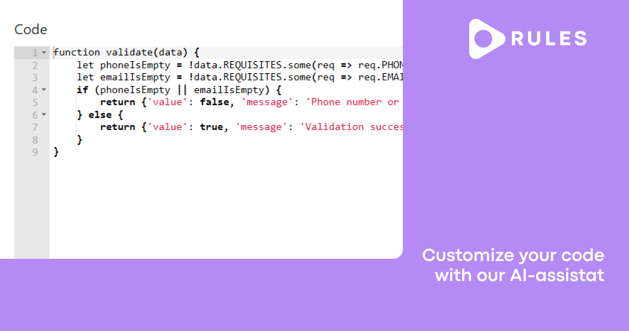 You don't need to know a programming language to create a rule: simply write the condition in the "Prompt" field, and our AI assistant will generate it automatically.