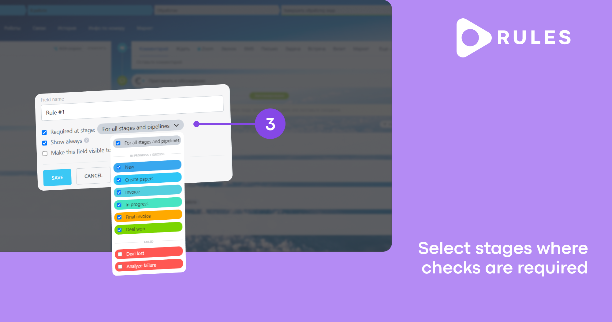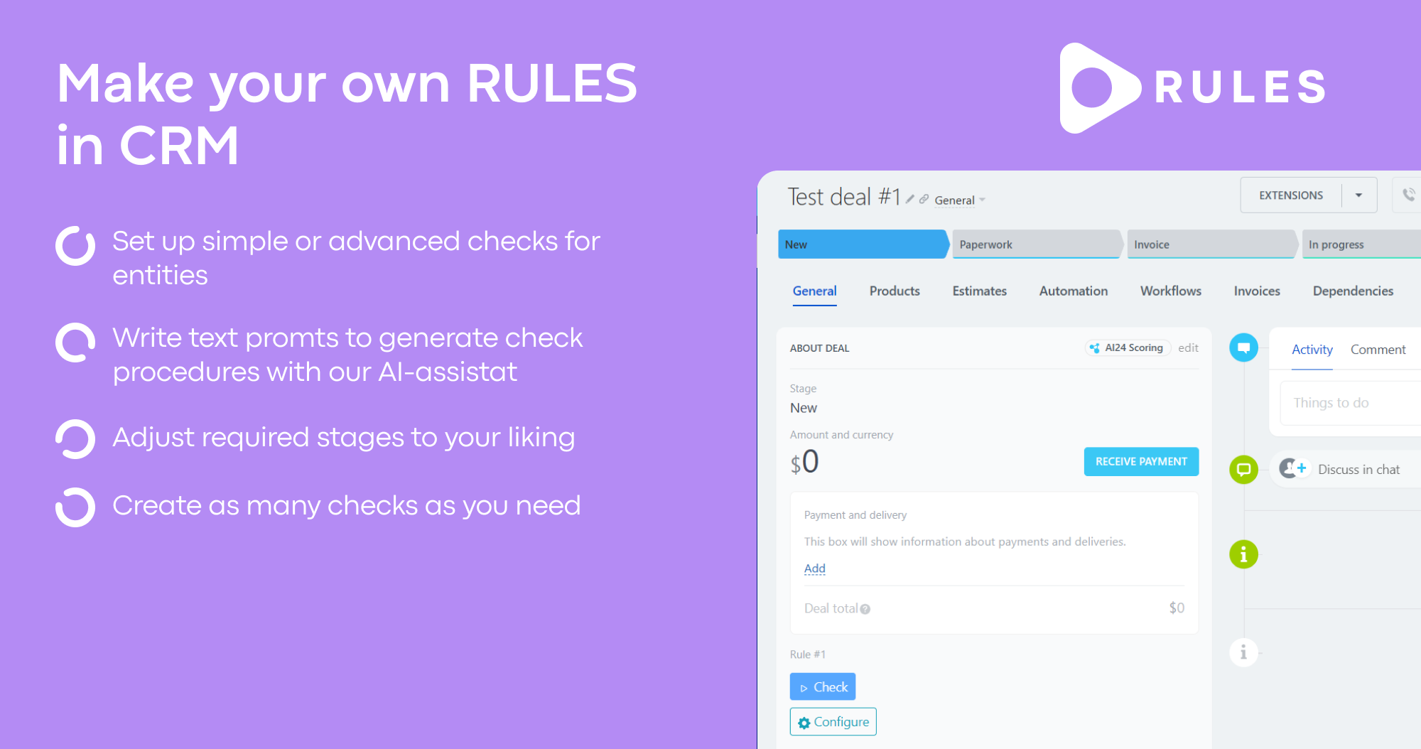 Expand the platform's functionality with us: set simple, medium, and complex checks when populating Leads and Deals and moving them through sales funnels.