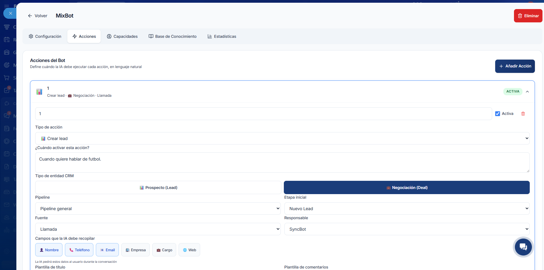 - Acciones Avanzadas en Bitrix24: SmartBot no solo chatea; ejecuta tareas. Puede transferir la conversación a un humano, Crear Tareas, Recopilar datos del cliente antes de transferir y Crear Leads en el CRM.