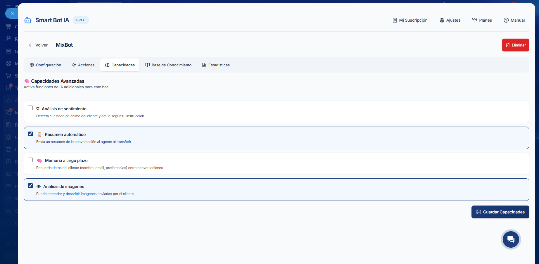 - Capacidades Cognitivas: Activa funciones premium como el Análisis de Sentimiento del cliente o Resúmenes Automáticos del chat al transferirlo a un agente.
