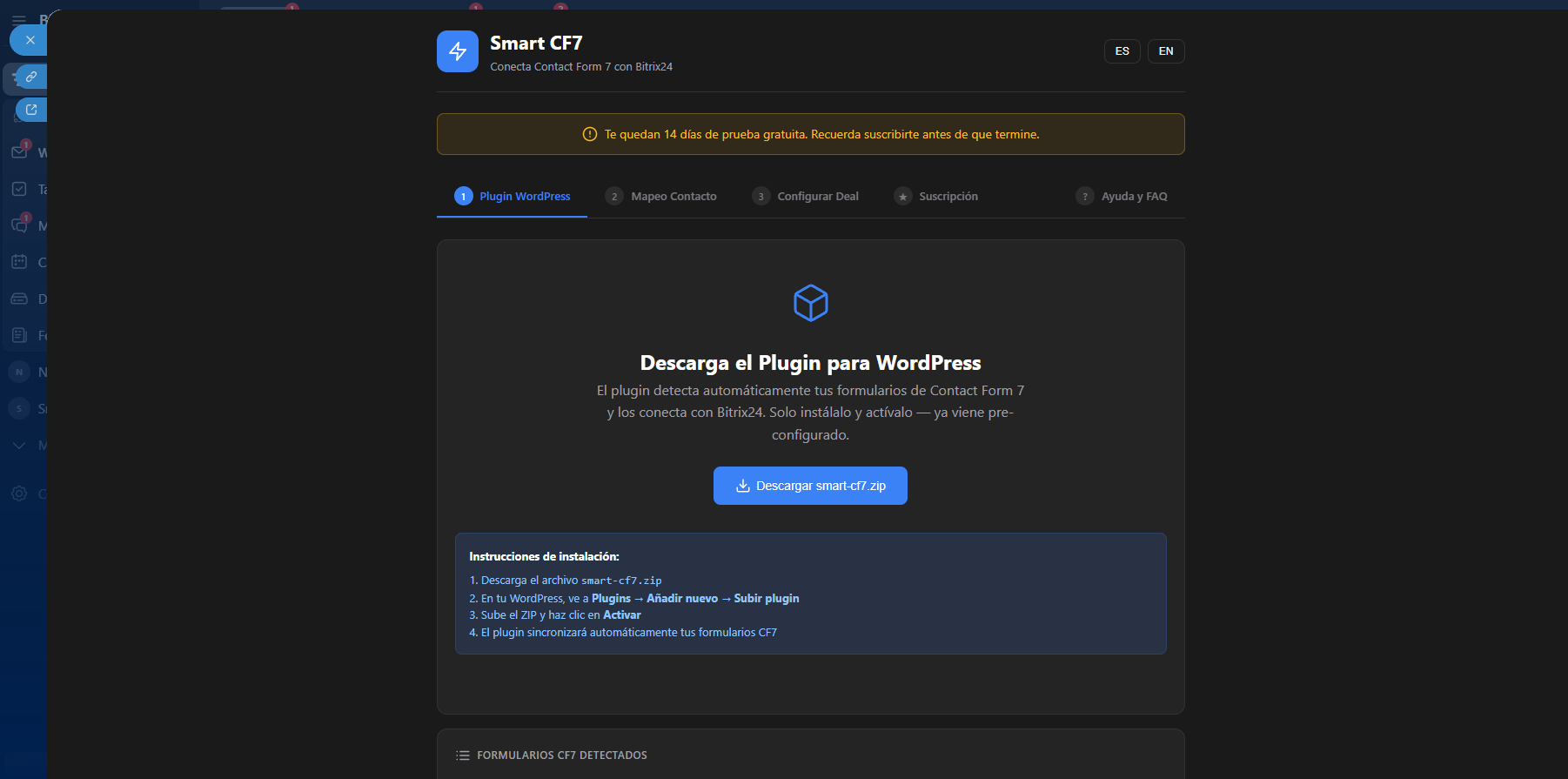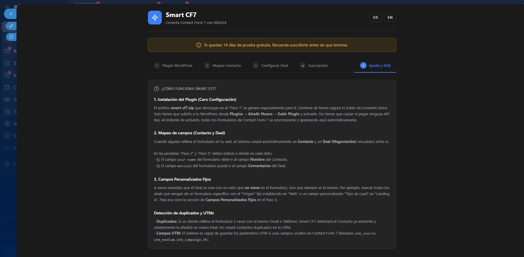 Ya sea que estés ejecutando campañas de marketing o captando solicitudes de soporte, Smart CF7 trabaja de forma invisible en segundo plano para asegurar que tu equipo de ventas obtenga todos los datos en tiempo real, directamente dentro de tu CRM Bitrix24.