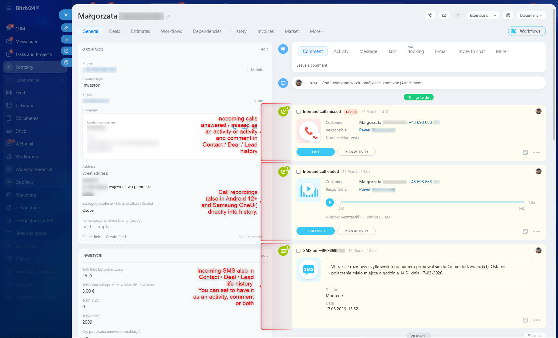 - SMS bidireccional, mensajes entrantes guardados directamente en la linea de tiempo del contacto en el CRM