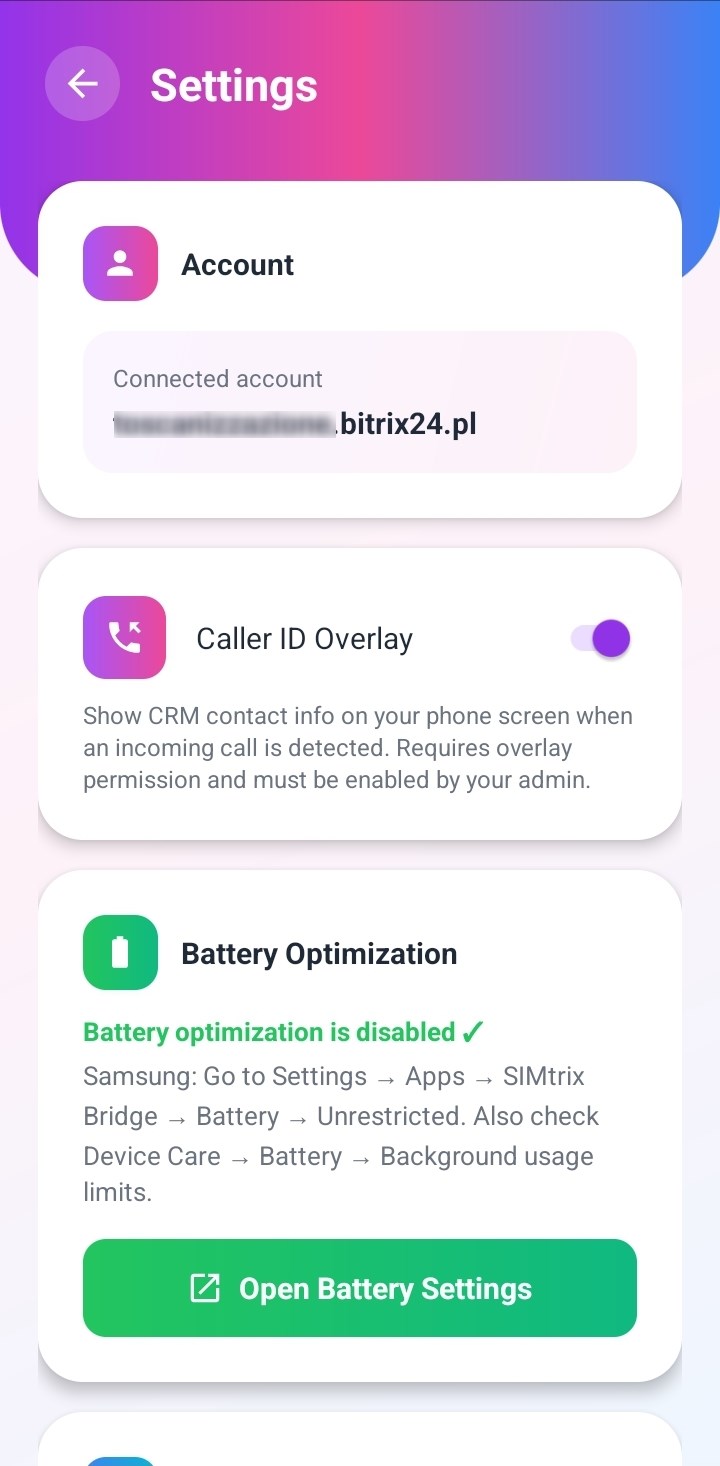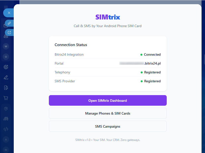 Cuando recibes una llamada, la pantalla de tu movil muestra un panel flotante con el nombre del contacto, empresa, negocio actual y etapa del negocio, todo obtenido en tiempo real desde Bitrix24. Sabe quien llama antes de contestar. - Colas de campanas SMS con intervalos inteligentes