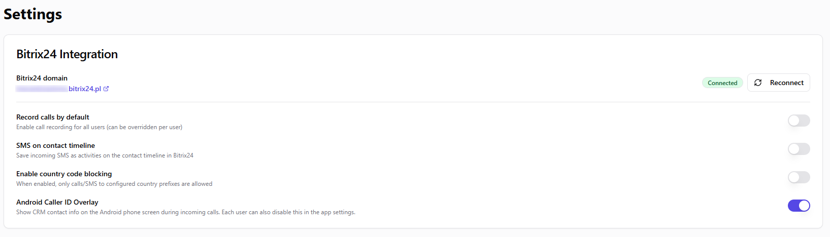 La mayoria de las apps de grabacion dejaron de funcionar tras las restricciones de Android 12 al audio de llamadas. SIMtrix Bridge restaura la grabacion completa de llamadas en dispositivos Android modernos. Graba ambos lados de la conversacion y sube automaticamente las grabaciones a la linea de tiempo de actividades de Bitrix24. Activa o desactiva la grabacion por usuario desde el panel de administracion. - Proteccion contra costes de llamadas y SMS internacionales