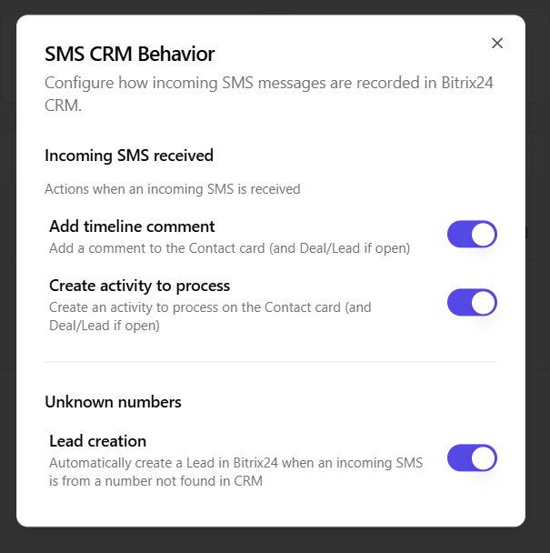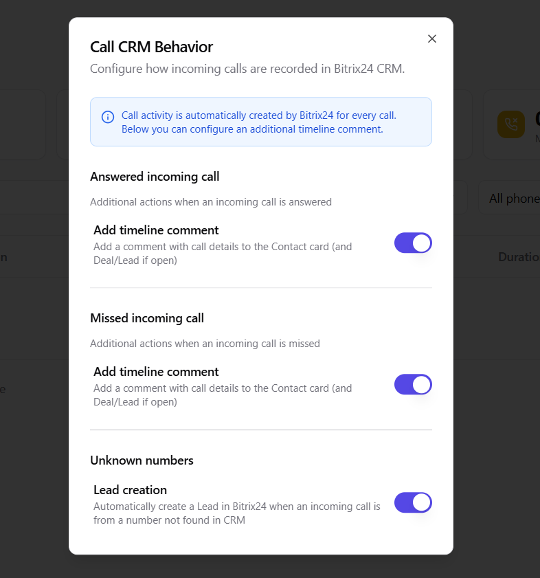 Cada llamada entrante de un numero no reconocido crea automaticamente un nuevo Lead en Bitrix24 con el numero de telefono adjunto. Sin entrada manual, sin oportunidades perdidas.