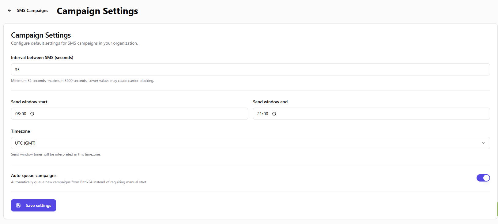 - Programacion por ventana horaria, define horas de inicio y fin para que los SMS se envien solo en horario laboral