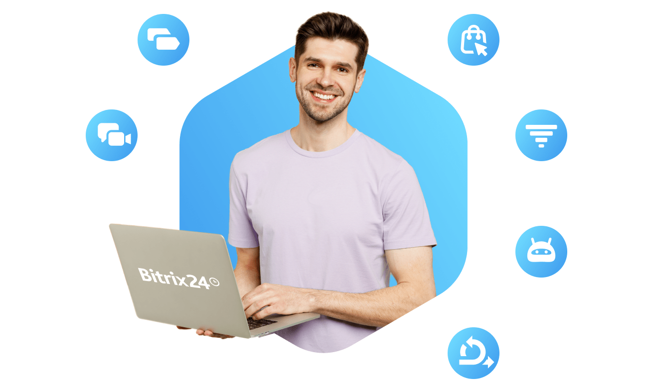 • Más de 35 herramientas para tu empresa: CRM, tareas, chat, videollamadas, almacenamiento de archivos, calendario, automatización del flujo de trabajo y más