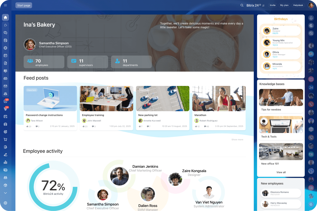 Personaliza la página de inicio en tu Bitrix24 para tener acceso rápido con un solo clic a la información importante del equipo y de la compañía.