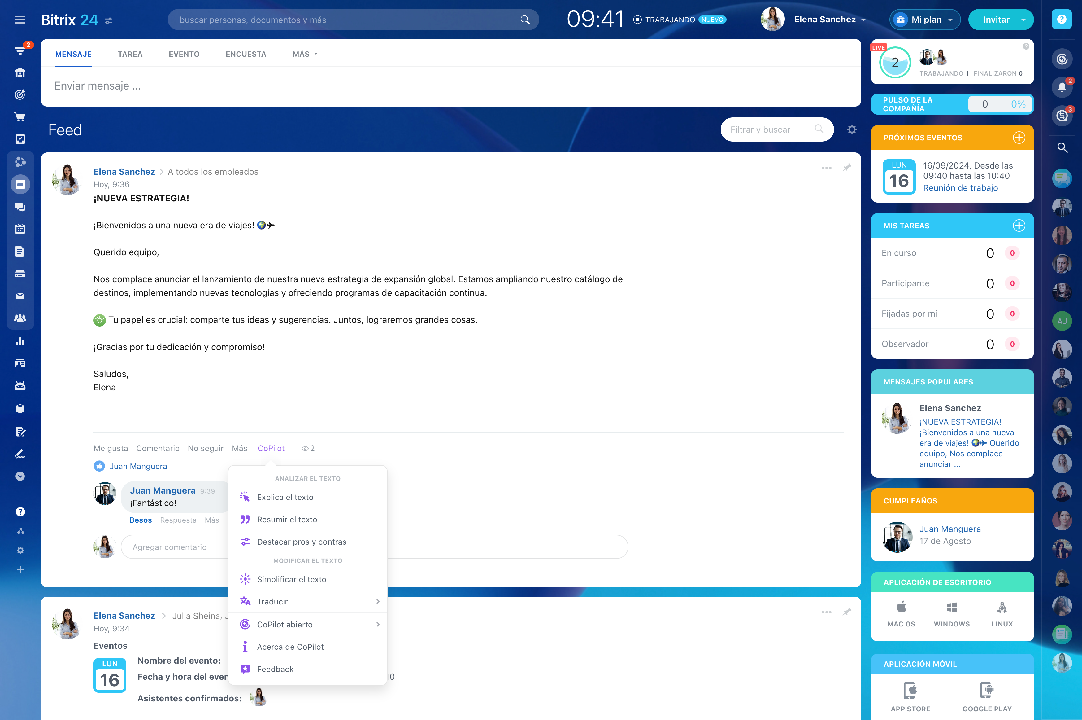 Tu feed en la plataforma de trabajo remoto, Bitrix24, está personalizado según los grupos y el departamento al que perteneces, etc. Puedes escribir publicaciones para todos los empleados o usuario/grupos selectos.