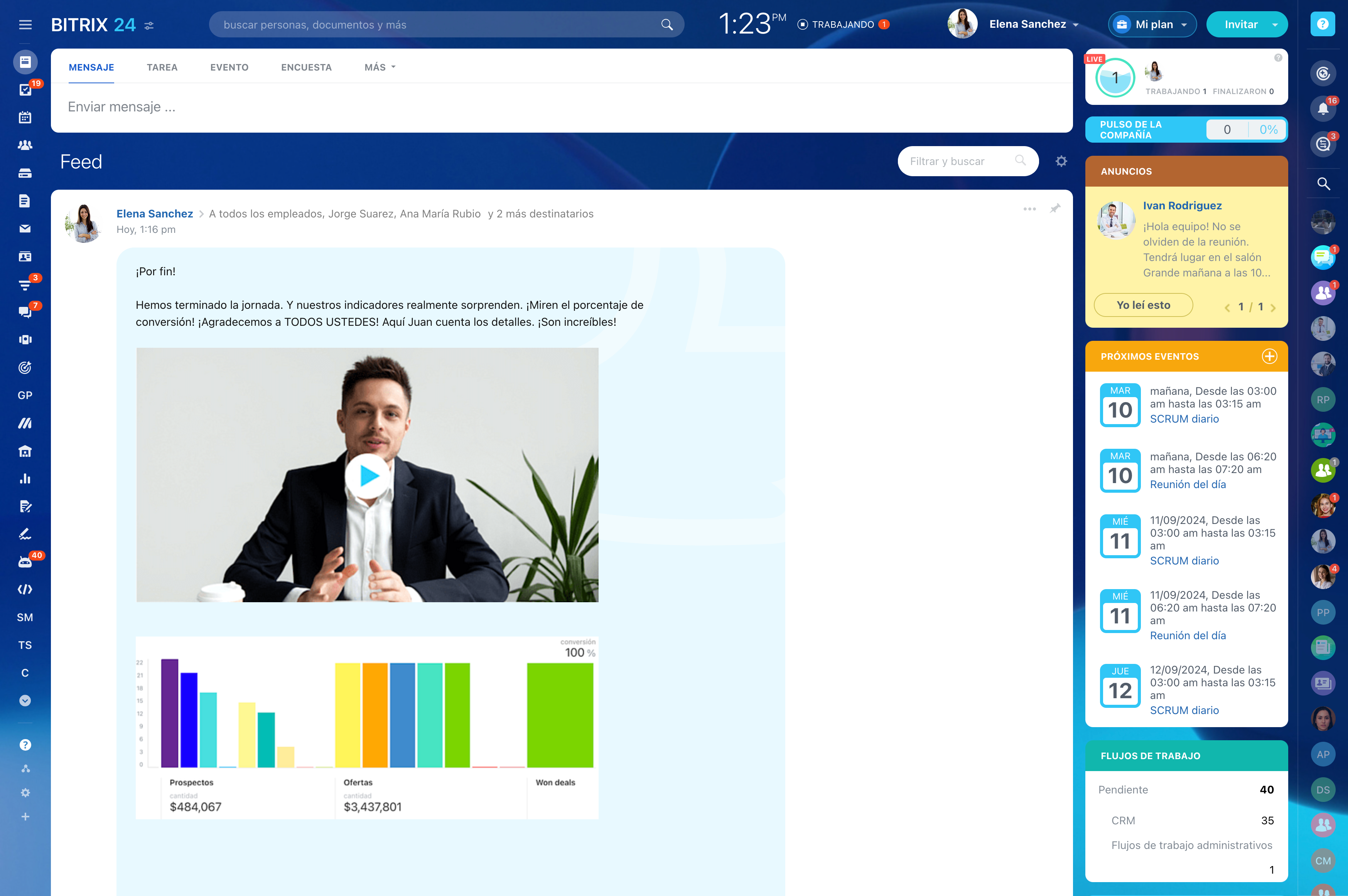 El feed de la plataforma de colaboración Bitrix24, es el lugar donde puedes leer las noticias de la compañía y tu equipo, ver anuncios, participar en encuestas y discusiones en comentarios, o compartir una publicación propia.